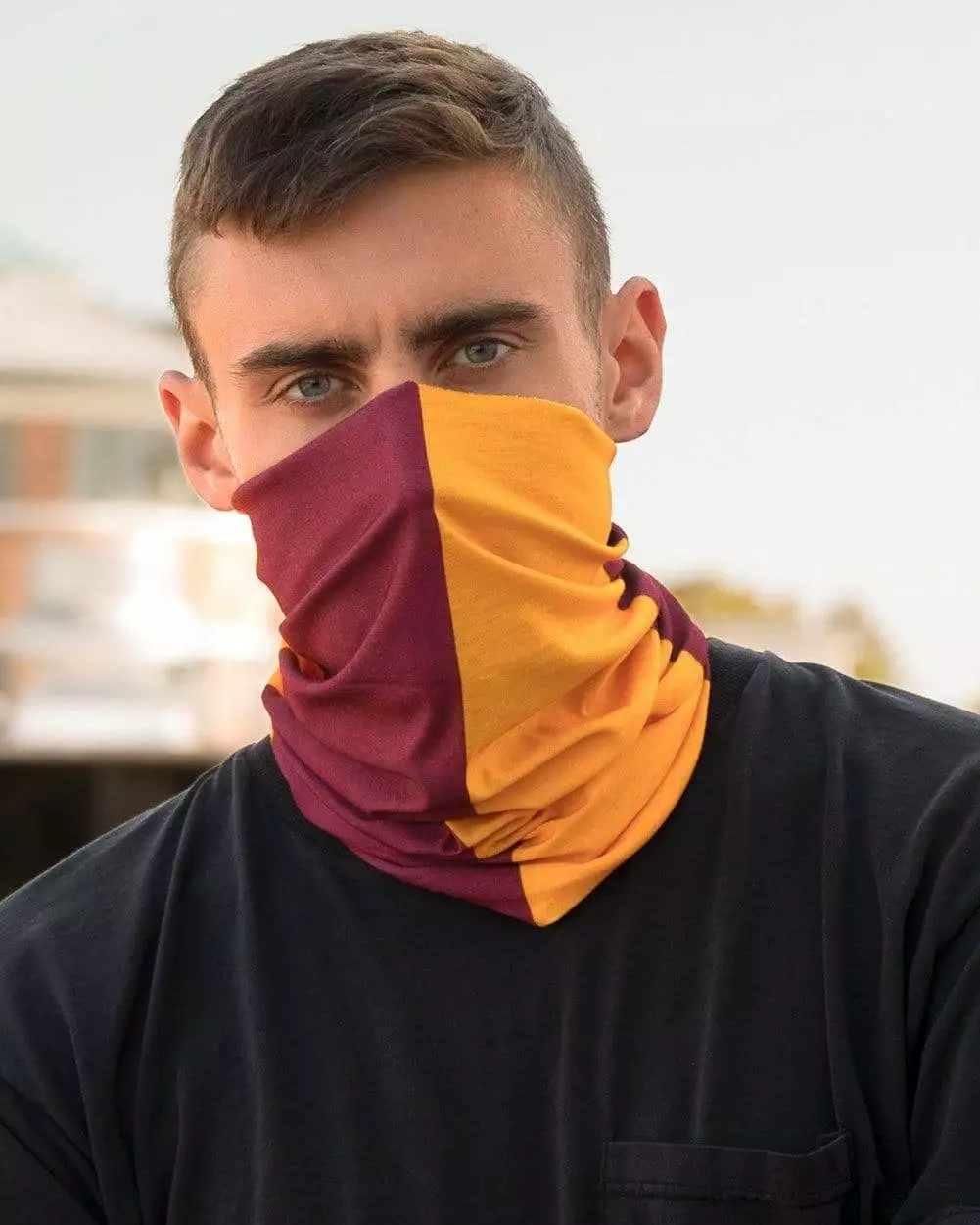 The Burgundy and Gold Seamless Mask Bandana is a multi-functional face-covering that slides easily over your head to cover your neck, mouth, and nose. It can also be worn as a headband, wristband, hair tie, and more!