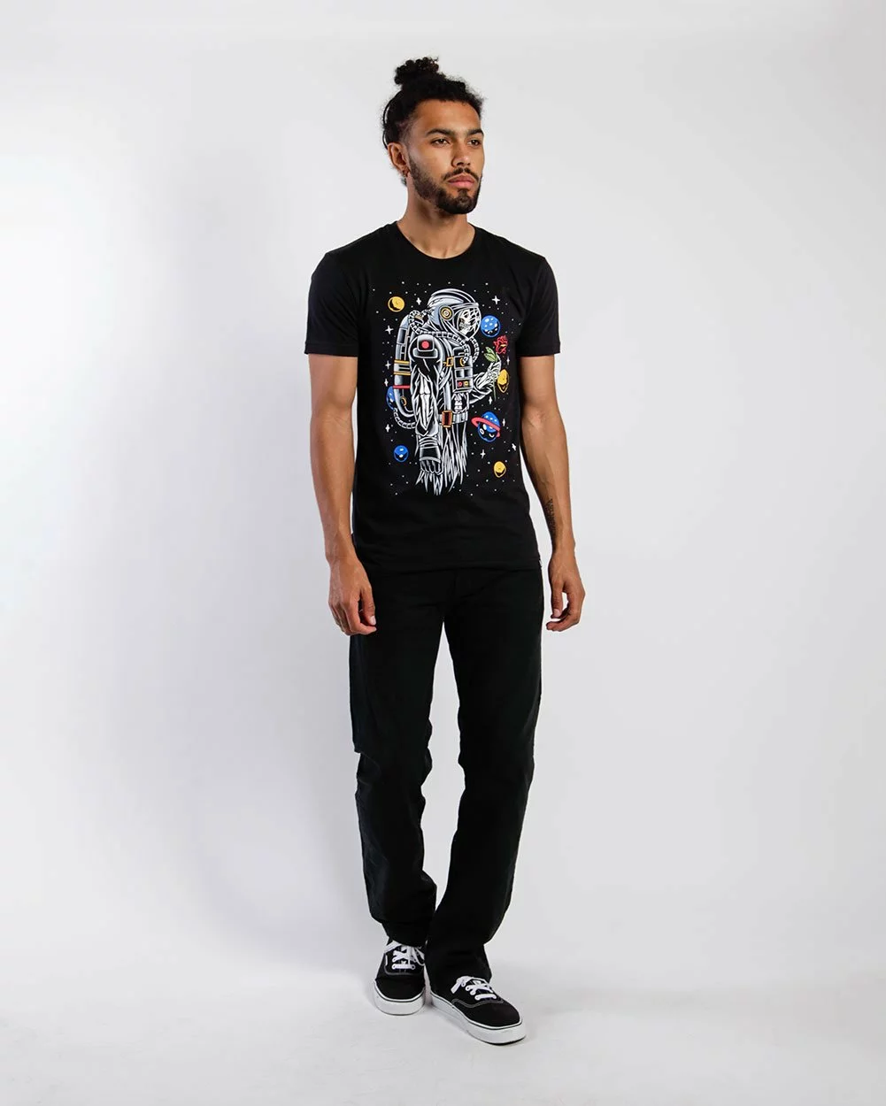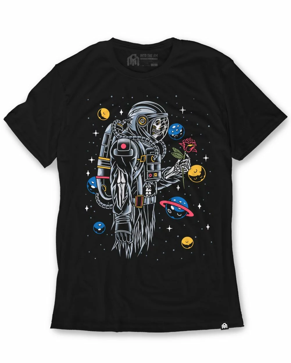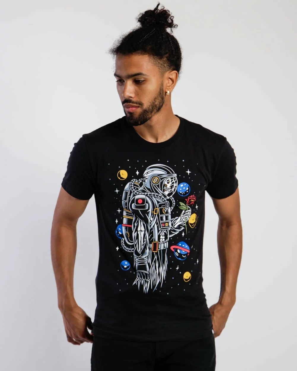 The interstellar circle of life spawns stardust and dark matter in the same sweet breath. But where our explorer finds a rose is the same spot he reaches the end on our original Galactic Cycle design on a black tee. This premium poly-cotton blend gives you the best of both worlds: a buttery soft blank that is breathable doesn’t shrink and lasts longer than 100% cotton tees.