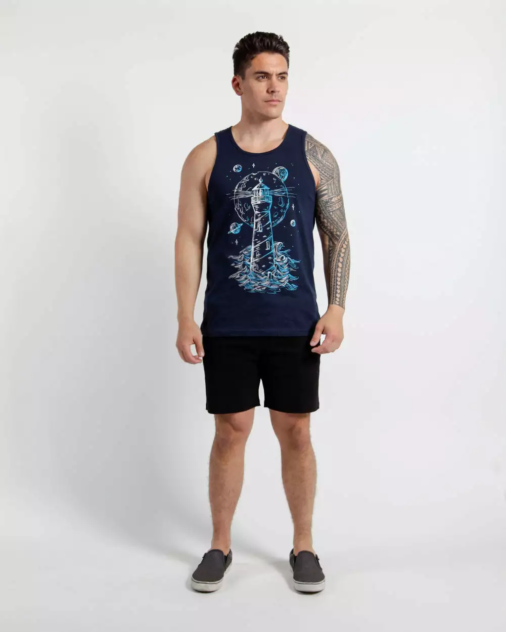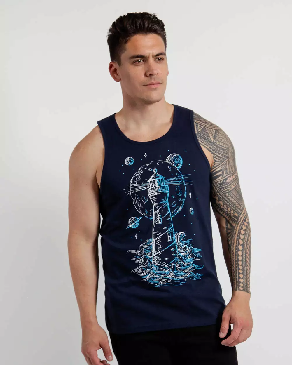 From Picard to Skywalker, weary galactic travelers need a beacon among the stars for a quick pit stop. Sure this lighthouse doesn’t look like it belongs up there, but who’s to say it can’t get the job done? With our original Lookout design on a premium ultra-soft men’s navy tank, you’ll be the one to decide.