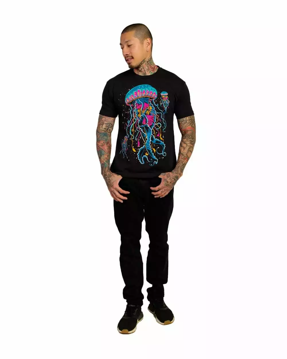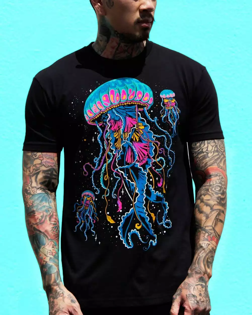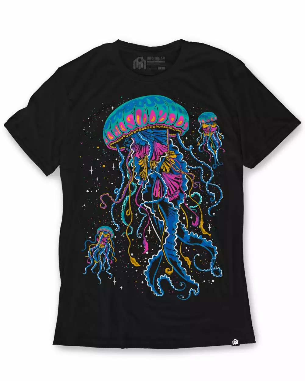 Billowing through the ocean, the translucent jellyfish shows off it’s bright blue, purple, and yellow. We’ll let you in on a little secret. The colors come from tiny pigment-changing organisms that have come along for the ride. A simpatico relationship illustrated with our original Luminance design on a premium ultra-soft men’s black t-shirt.