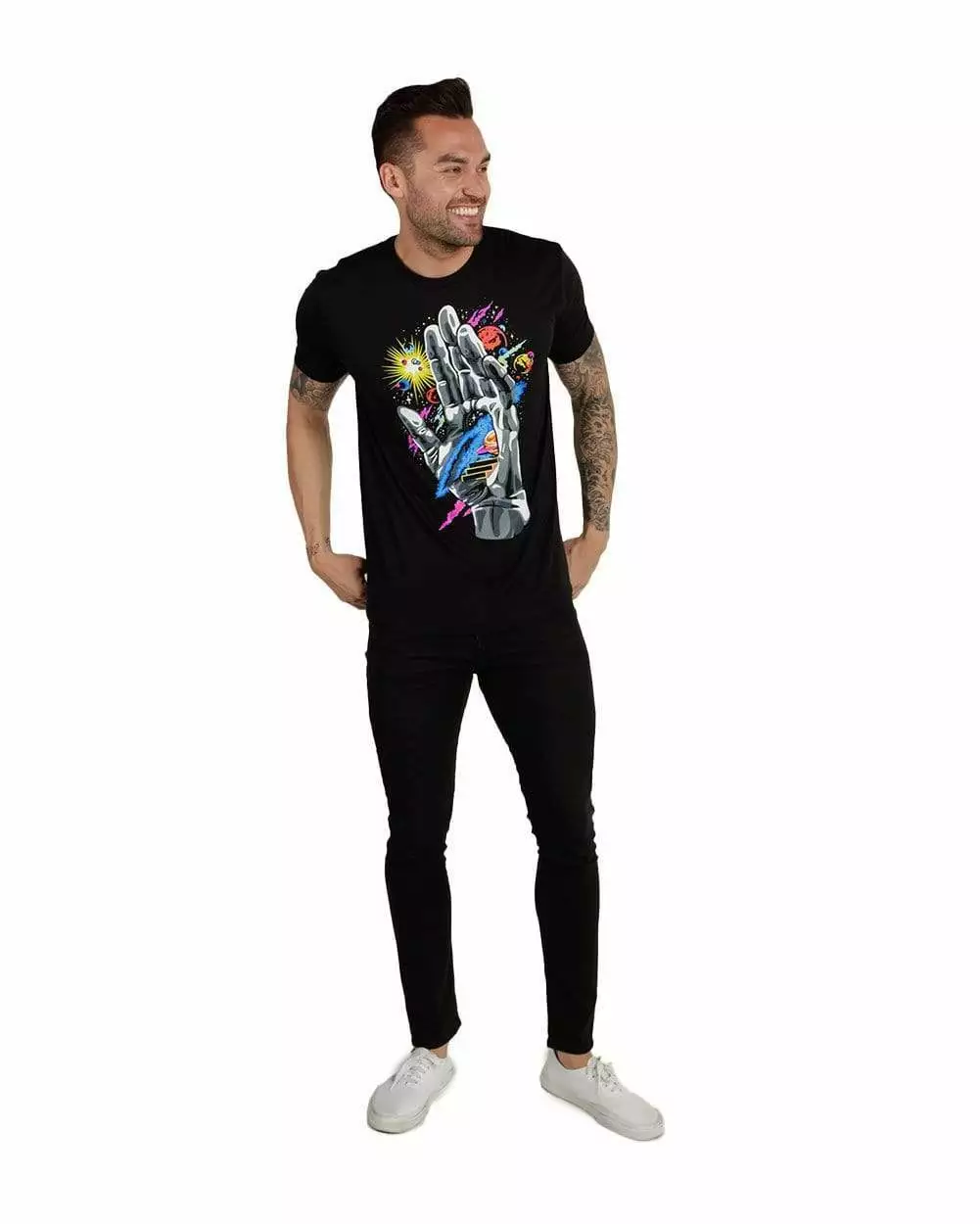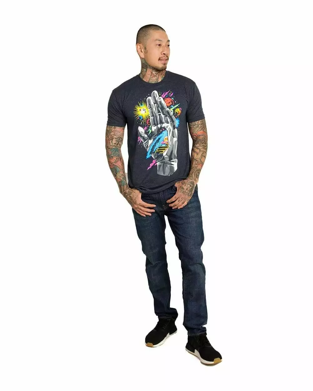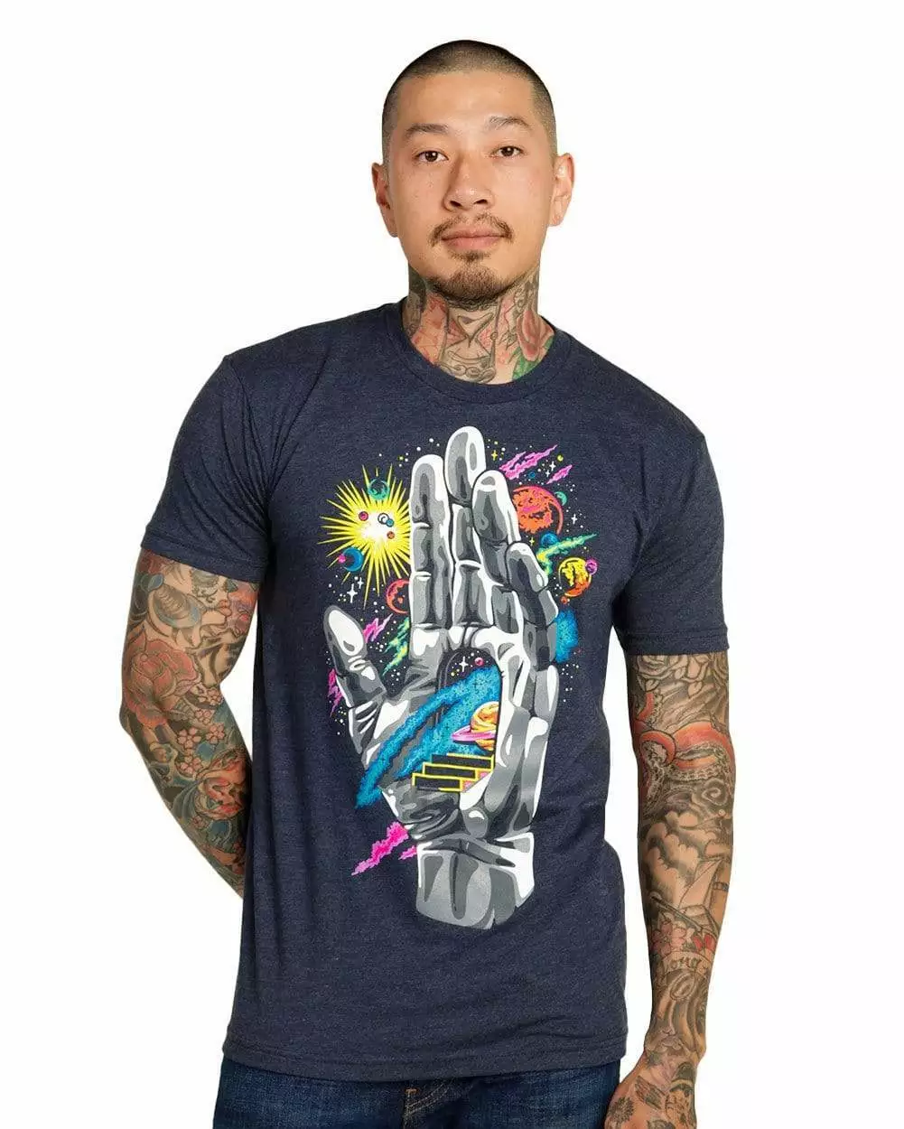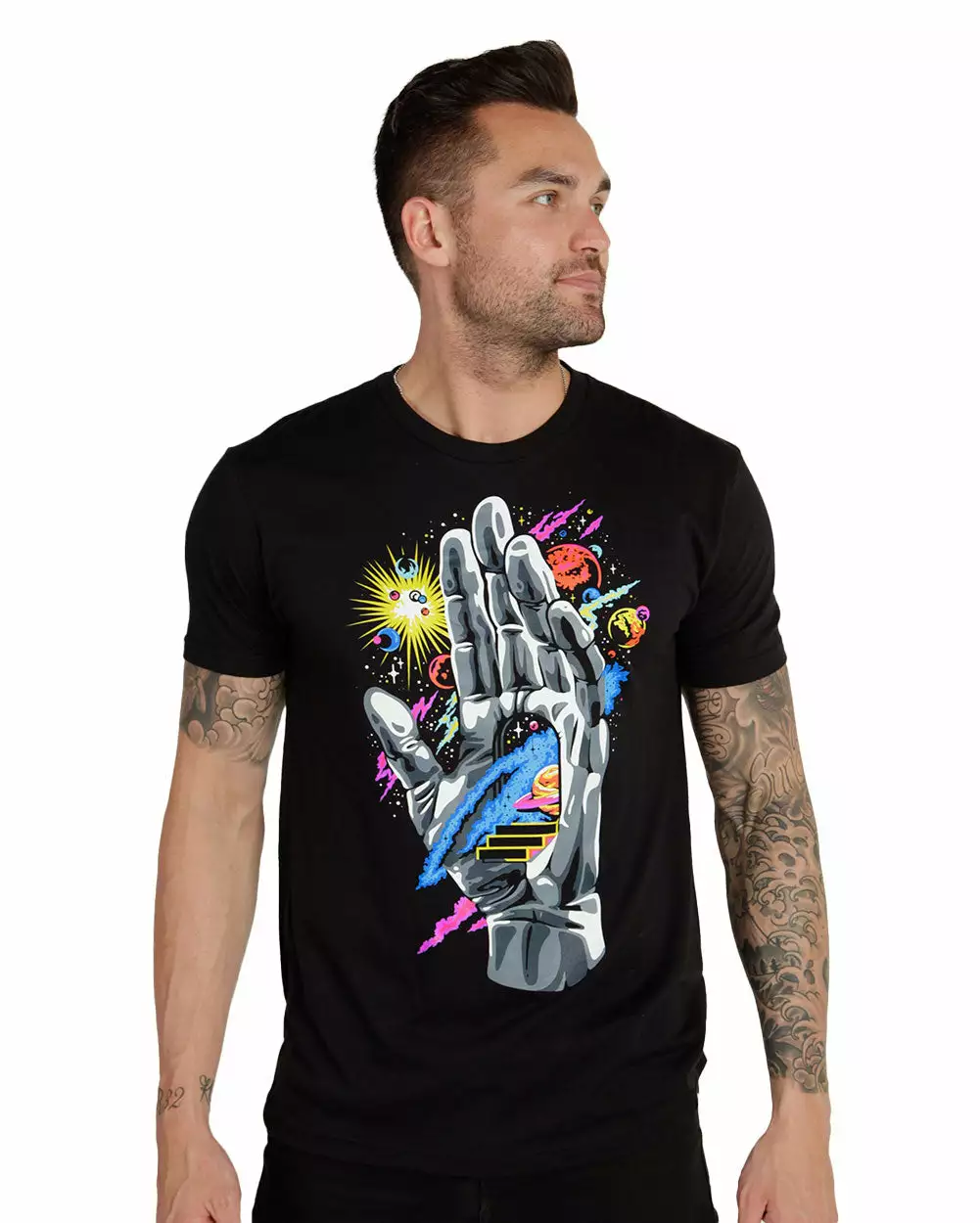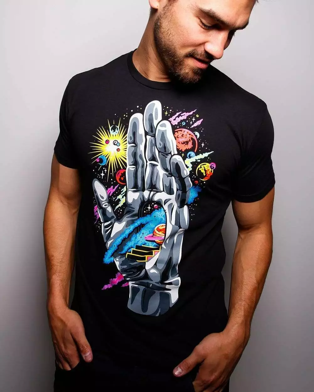 Find the guiding hand of the universe, in this vibrant graphic tee. The moons, stars, planets, and origin of the universe started here. Push through and follow the steps to your destiny with this psychedelic premium tee. It is tailored from ultra-soft fabric and printed with the highest quality inks.
