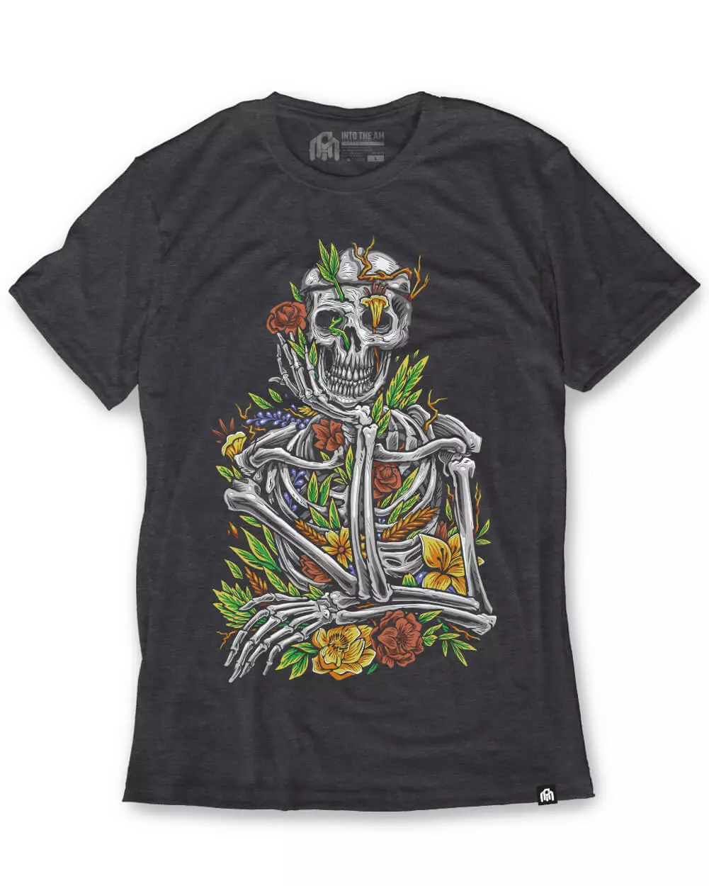 From death ultimately comes life. This lost soul, reduced to decay is now nothing but a monument of bones adorned by flowers and fauna. Mushrooms, blossoms, and vines embellish the skeleton as they weave their way through the crevasses of his departed body. They serve as a reminder that even from ruins new life can be reborn.
