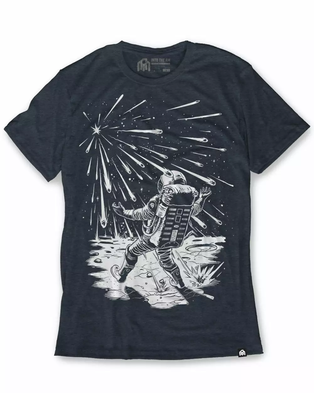 Our galactic explorer is caught in the storm. Raining down a torrent of asteroids, the heavens show no favorites. He must find his way to safety on our original Star Fire design on a navy tee. This premium poly-cotton blend gives you the best of both worlds: a buttery soft blank that is breathable doesn’t shrink and lasts longer than 100% cotton tees.