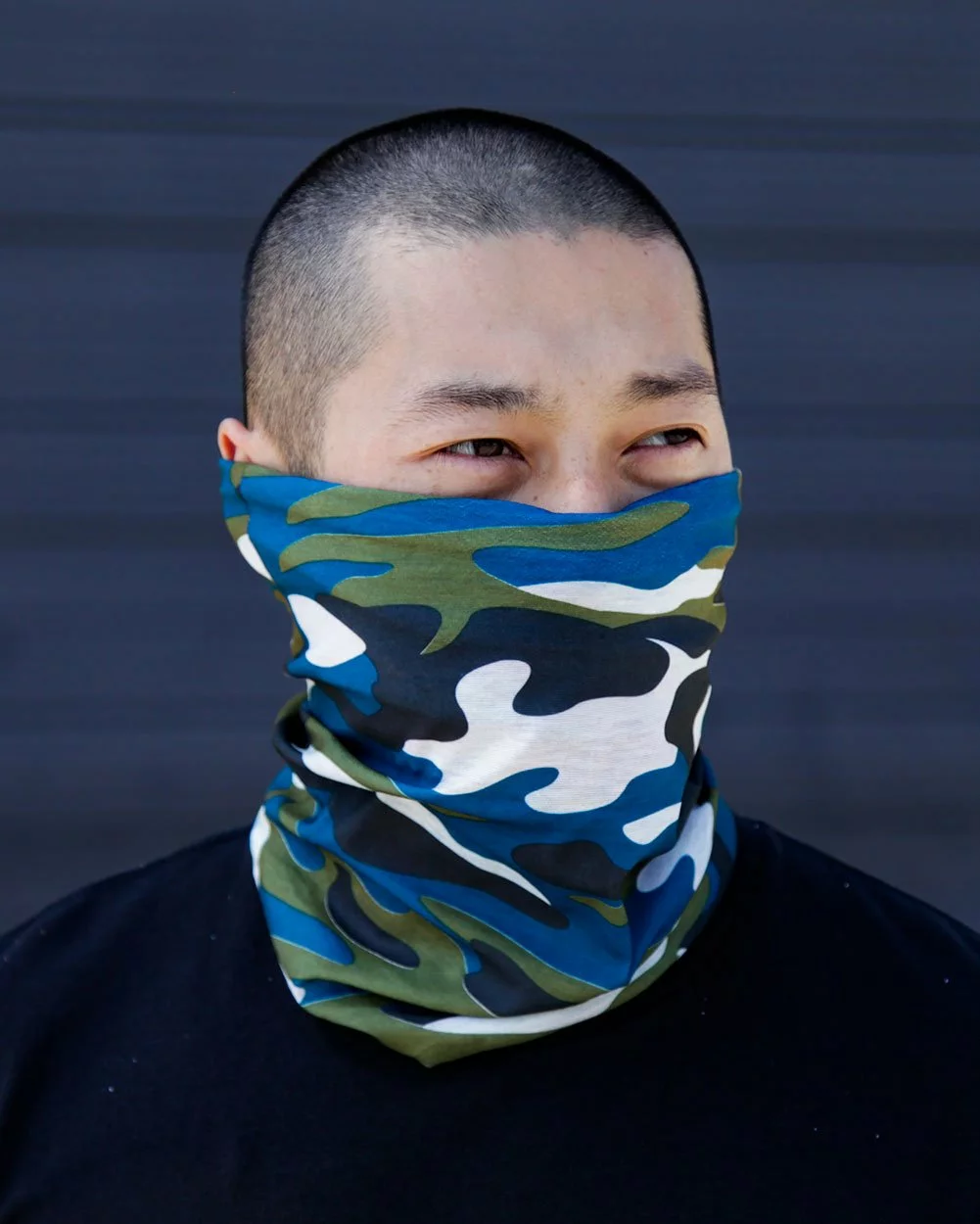The Blue Camo Seamless Mask Bandana is a multi-functional face-covering that slides easily over your head to cover your neck, mouth, and nose. It can also be worn as a headband, wristband, hair tie, and more!