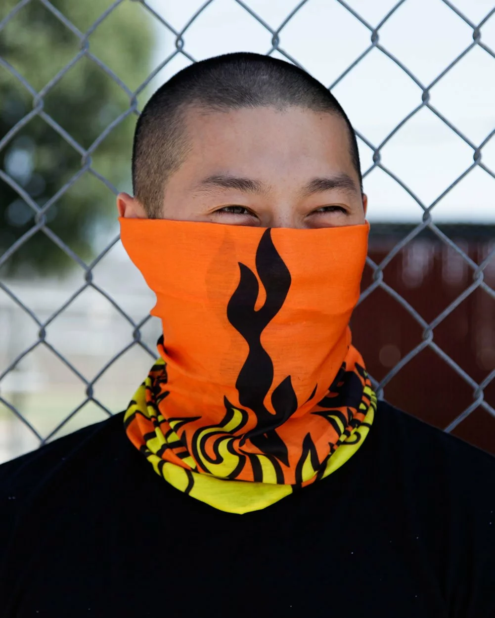 The Orange Flame Seamless Mask Bandana is a multi-functional face-covering that slides easily over your head to cover your neck, mouth, and nose. It can also be worn as a headband, wristband, hair tie, and more!