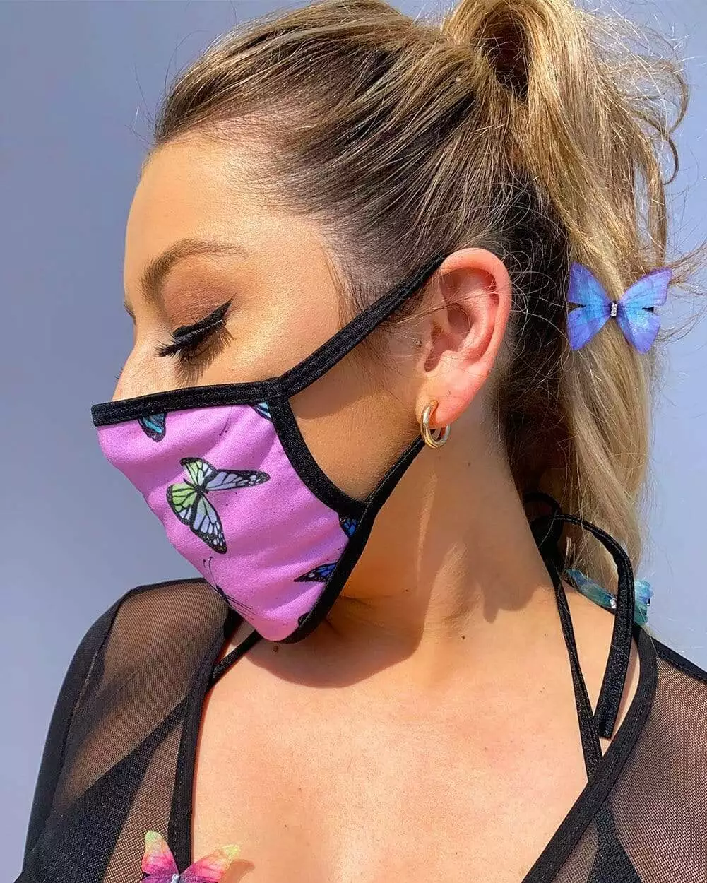 Flutter through life in our Butterfly Groove Face Mask. This pink butterfly face mask is contoured to fit your face and designed with soft straps that comfortably stretch to fit over your ears.